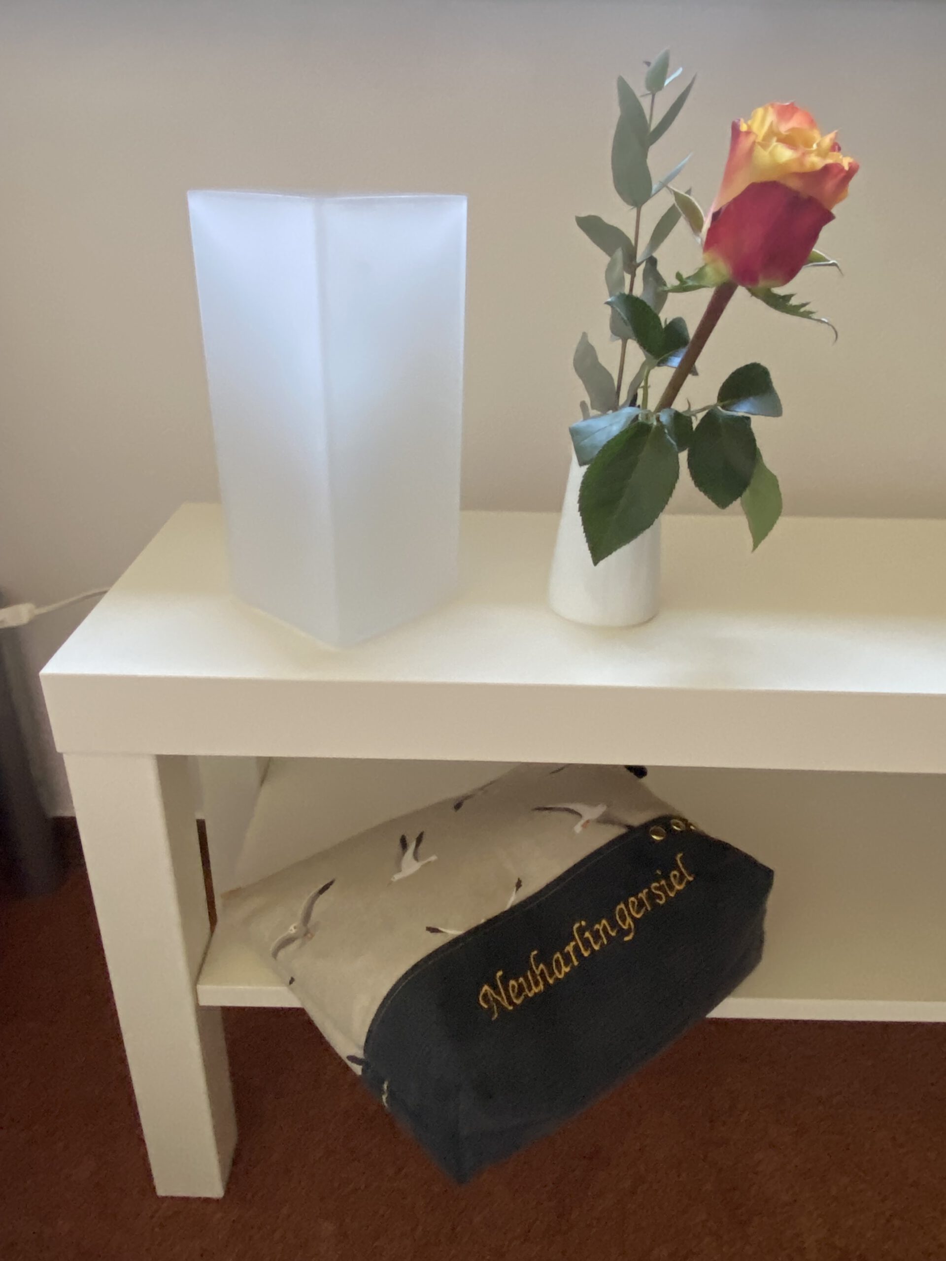 Bad mit Dusche, Waschbecken, Toilette, Durchlauferhitzer; Flur.